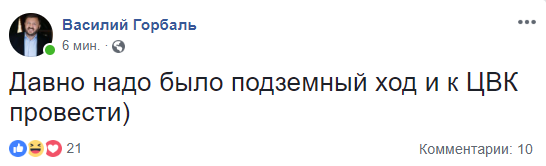 "Давно надо было подземный ход и к ЦВК провести)", шутит экс-нардеп Василий Горбаль.