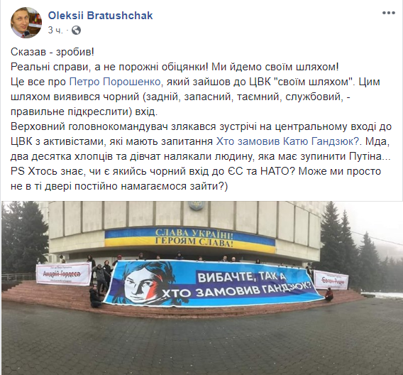 "Верховный главнокомандующий испугался встречи на центральном входе в ЦИК с активистами, которые есть вопросы Кто заказал Катю Гандзюк ? Мда, два десятка ребят напугали человека, который должен остановить Путина", - недоумевает Братущак.