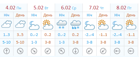 По данным Укргидрометцентра, неделя начнется с температуры +3....+5. Затем показатели опустятся на пару градусов до 0...+2, а в четверг-пятницу днем вернется небольшой минус до -1...+1. В среду, 6 февраля, обещают осадки в виде дождя со снегом.