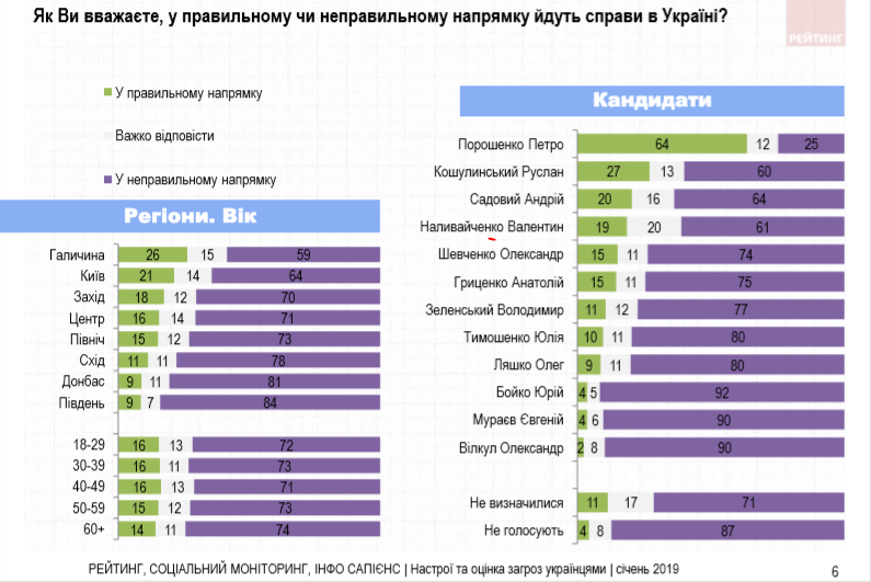 Наиболее пессимистично настроены по развитию состояния дел в стране жители юго-восточных областей и Донбасса, относительно меньше - Галичины. 12% опрошенных ничего не смогли ответить на этот вопрос. Интересно, что лучше оценивают ситуацию избиратели Петра Порошенко. Зато среди сторонников других кандидатов преобладают негативные оценки.