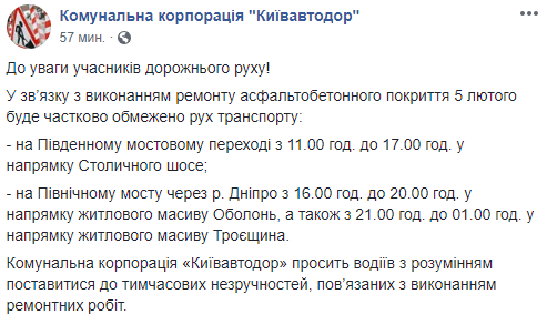 Во вторник, 5 февраля, в Киеве ограничат движение по Южному и Северному мостам в связи с выполнением ремонта асфальтобетонного покрытия. Об этом сообщается на странице коммунальной корпорации "Киевавтодор" в Facebook.