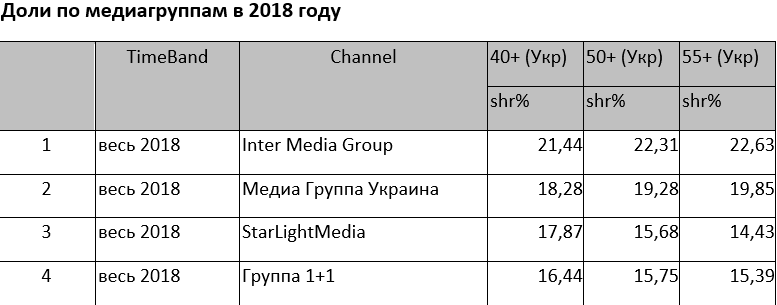 Лидирует здесь "Интер" (принадлежит предпринимателю Дмитрию Фирташу и нардепу Сергею Левочкину). Именно у него наибольшая аудитория 50+, судя по усредненным данным за 2018 год.