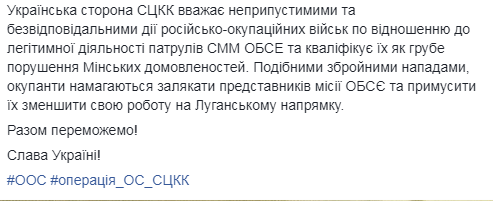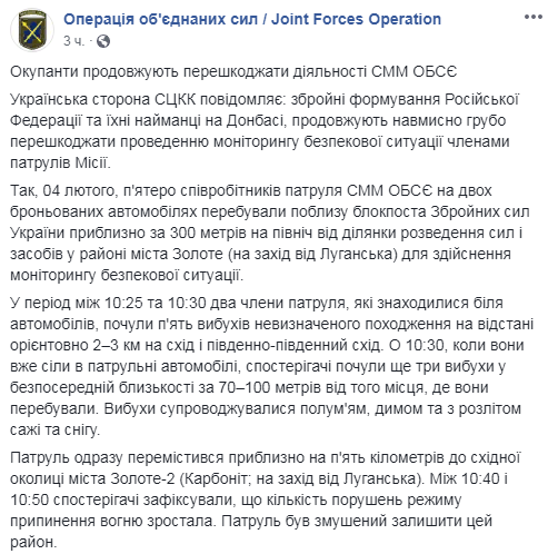 В понедельник, 4 февраля, в районе Золотого Луганской области патруль СММ ОБСЕ попал под обстрел. Об этом сообщается на странице операции Объединенных сил в соцсети Facebook.