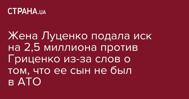 Жена генпрокурора и нардеп Ирина Луценко подала иск против кандидата в президенты Анатолия Гриценко о защите чести и достоинства семьи из-за спора вокруг службы ее сына Александра в зоне АТО. Об этом она заявила в эфире телеканала ZIK.