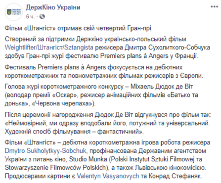 Украинско-польский фильм "Штангист" режиссера Дмитрия Сухолиткого-Собчука, созданный при поддержке Государственного агентства Украины по вопросам кино, получил гран-при жюри фестиваля Premiers plans à Angers во Франции.