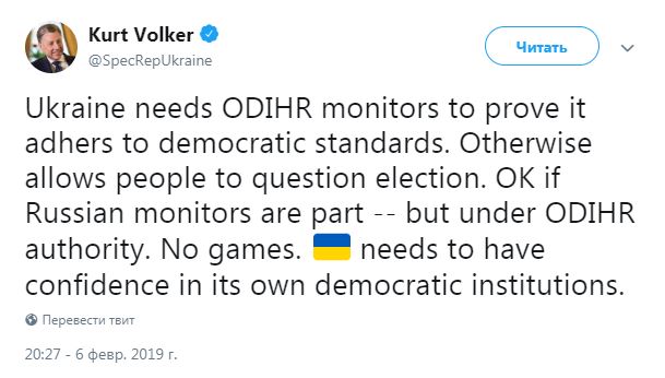"Украине нужны наблюдатели от ОБСЕ, чтобы доказать соответствие демократическим стандартам. В противном случае выборы могут быть поставлены под сомнение. Приемлемо, если российские наблюдатели под контролем БДИПЧ (Бюро по демократическим институтам и правам человека - Прим. Ред.) ОБСЕ примут участие в выборах. Никаких игр. Украина должна быть привержена демократическим институтам", - написал Волкер.