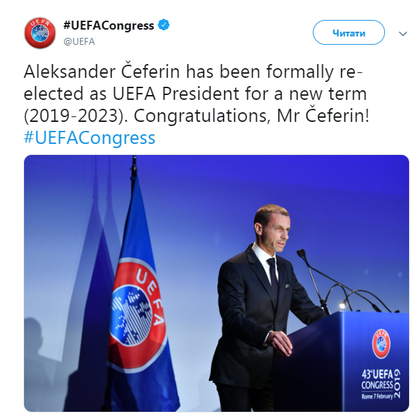 Нынешний глава УЕФА Александр Чеферин переизбран на пост президента УЕФА на очередной четырехлетний срок. Он будет руководить европейским футболом до 2023 года. За него единогласно проголосовали все национальные федерации. Да и к тому же 51-летний Чеферин был единственным кандидатом на этот пост.