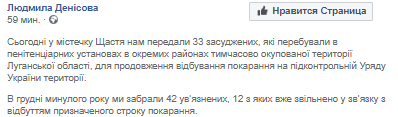 "Сегодня в городке Счастье нам передали 33 осужденных, находящихся в пенитенциарных учреждениях в отдельных районах временно оккупированной территории Луганской области, для продолжения отбывания наказания на подконтрольной правительству Украины территории", - написала Денисова в своей странице в соцсети.