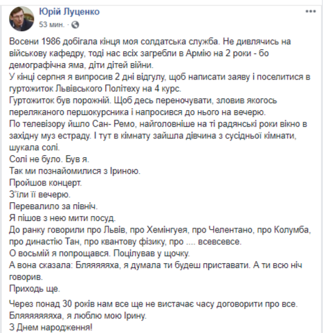 Луценко  рассказал историю знакомства  со своей будущей женой. Это случилось в общежитии  Львовского Политеха - они всю ночь провели на кухне за разговором, а на утро Ирина Луценко сказала: "Бляяяяха, я думала ты будешь приставать. А ты всю ночь говорил". "Спустя более 30 лет нам все еще не хватает времени договорить обо всем. Бляяяяха, я люблю мою Ирину", - написал Генпрокурор.
