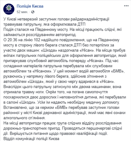 В Киеве на Южном мосту нетрезвый заместитель председателя Голосеевской райгосадминистраций Юрий Ткаченко травмировал патрульную, которая оформляла дорожно-транспортное происшествие, сообщили в отделе коммуникации полиции Киева.