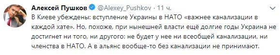 А в России настроены далеко не так оптимистично. Российский сенатор Алексей Пушков в своем Twitter заявил об убеждении Киева, что вступление Украны в НАТО "важнее канализации в каждой хате". При этом он заявил, что в Альянс "без канализации не принимают", а у Украины не будет ни того, ни другого.