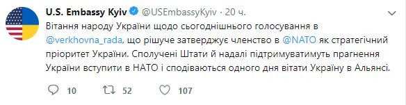 США продолжат поддерживать стремление Украины вступить в Организацию Североатлантического договора (НАТО). Об этом говорится в сообщении Посольства США в Украине в "Твиттере". "Поздравление народу Украины с сегодняшним голосованием в Верховной Раде, которое решительно утверждает членство в НАТО как стратегический приоритет Украины. Соединенные Штаты и в дальнейшем будут поддерживать стремление Украины вступить в НАТО и надеются однажды приветствовать Украину в Альянсе", - подчеркнули американские дипломаты.