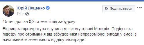 "15 тысяч долларов за 0,3 га земли под застройку. Винницкая прокуратура вручила мэру Могилев-Подольского подозрение о получении от застройщика неправомерной выгоды в сговоре с начальником земельного отдела горсовета", - написал он. На фото, который привел Луценко изображен мэр города Петр Бровко.