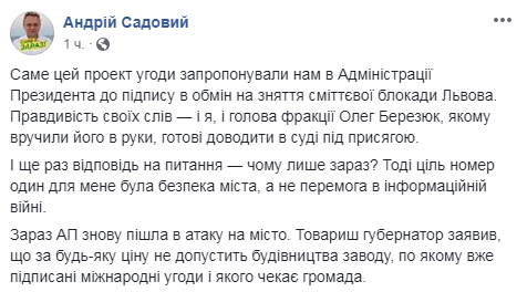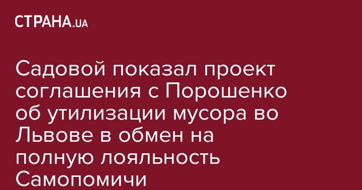 Городской глава Львова, кандидат в президенты Украины Андрей Садовой опубликовал соглашение, которое ему якобы предлагали на подпись от имени президента Украины Петра Порошенко в обмен на решение вопроса об утилизации мусора во Львове. Условия "соглашения" он обнародовал в Facebook.