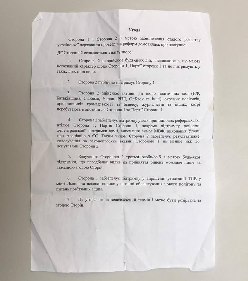 В документе, опубликованном Садовым, говорится, что "Сторона 1 и Сторона 2 с целью обеспечения устойчивого развития украинского государства и проведения реформ" договорились о том, что "Самопомич" не критикует и публично поддерживает действия президента.
