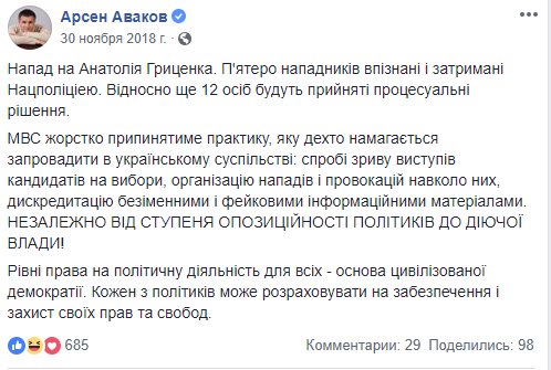 "Нападение на Анатолия Гриценко. Пятеро нападавших опознаны и задержаны Нацполицией. В отношении еще 12 человек будут приняты процессуальные решения", - отметил Аваков.