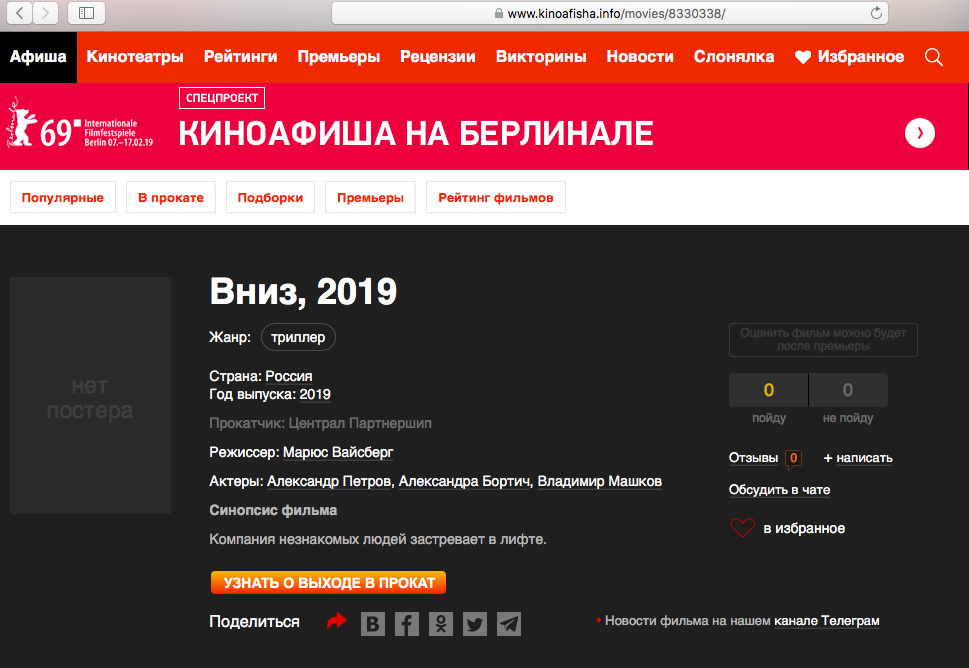 Мариус Бальчюнас не вышел на связь с корреспондентом "Страны". Однако нам ответили российский кинодистрибьютор и "главный герой" - Александр Петров ("Полицейский с Рублевки", "Т-34"). Прокатчик указал, что фильм "Вниз" в графике у них не стоит, а представители Петрова отметили, что в такой картине он не снимается.