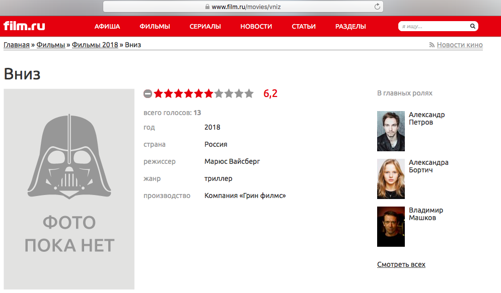 В Интернете фильму "Вниз" внимание уделили буквально пару сайтов. Указывается, что режиссер - Вайсберг. Прокатчик - Централ Партнершип. Актеры: Александр Петров, Александра Бортич, Владимир Машков (Петров и Бортич сейчас считаются одними из самых востребованных и популярных в РФ, - прим.Ред.).