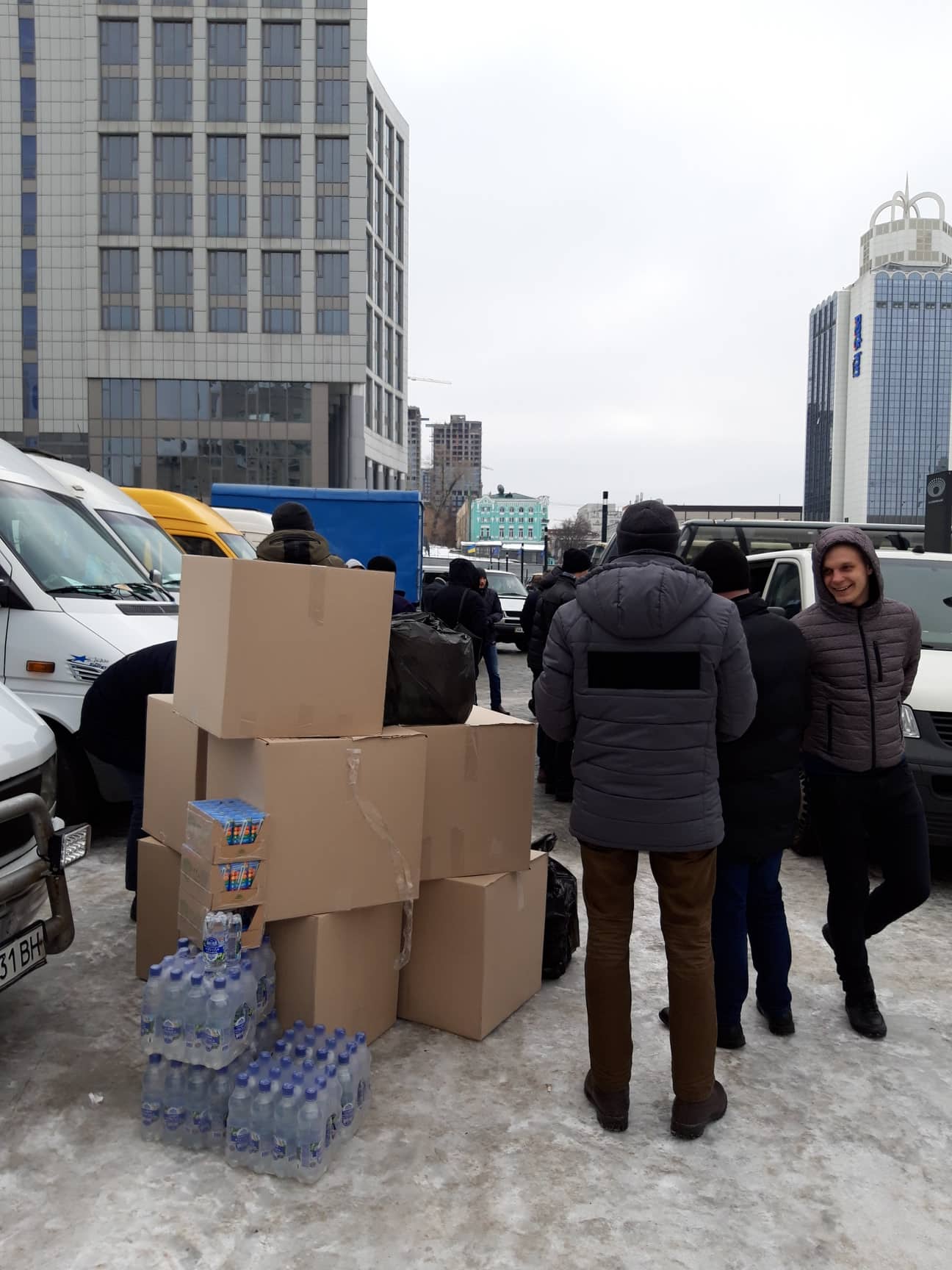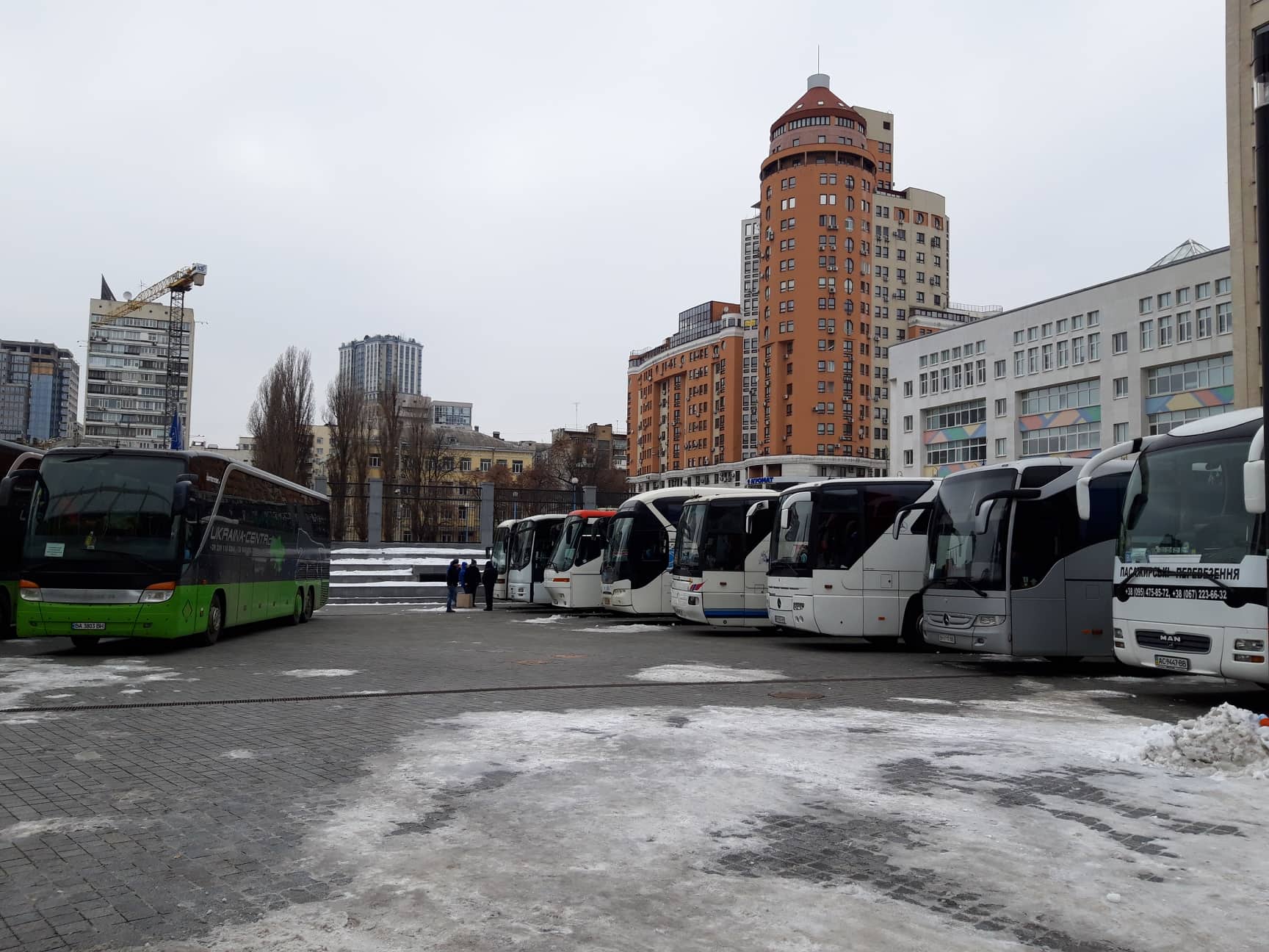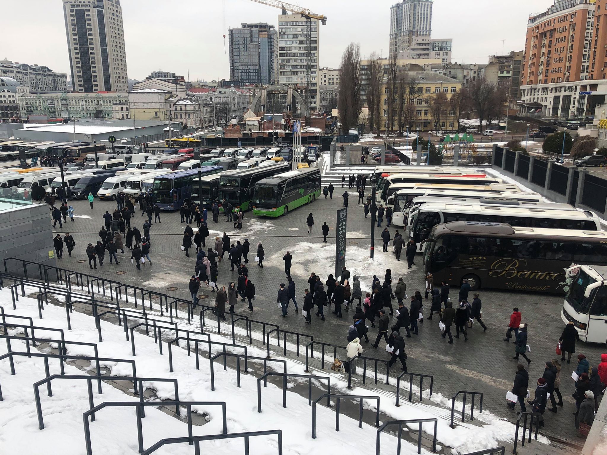 13:10 Появились панорамные фото у Дворца Спорта. С высокой точки видно количество автобусов, которые привезли людей на форум Петра Порошенко.