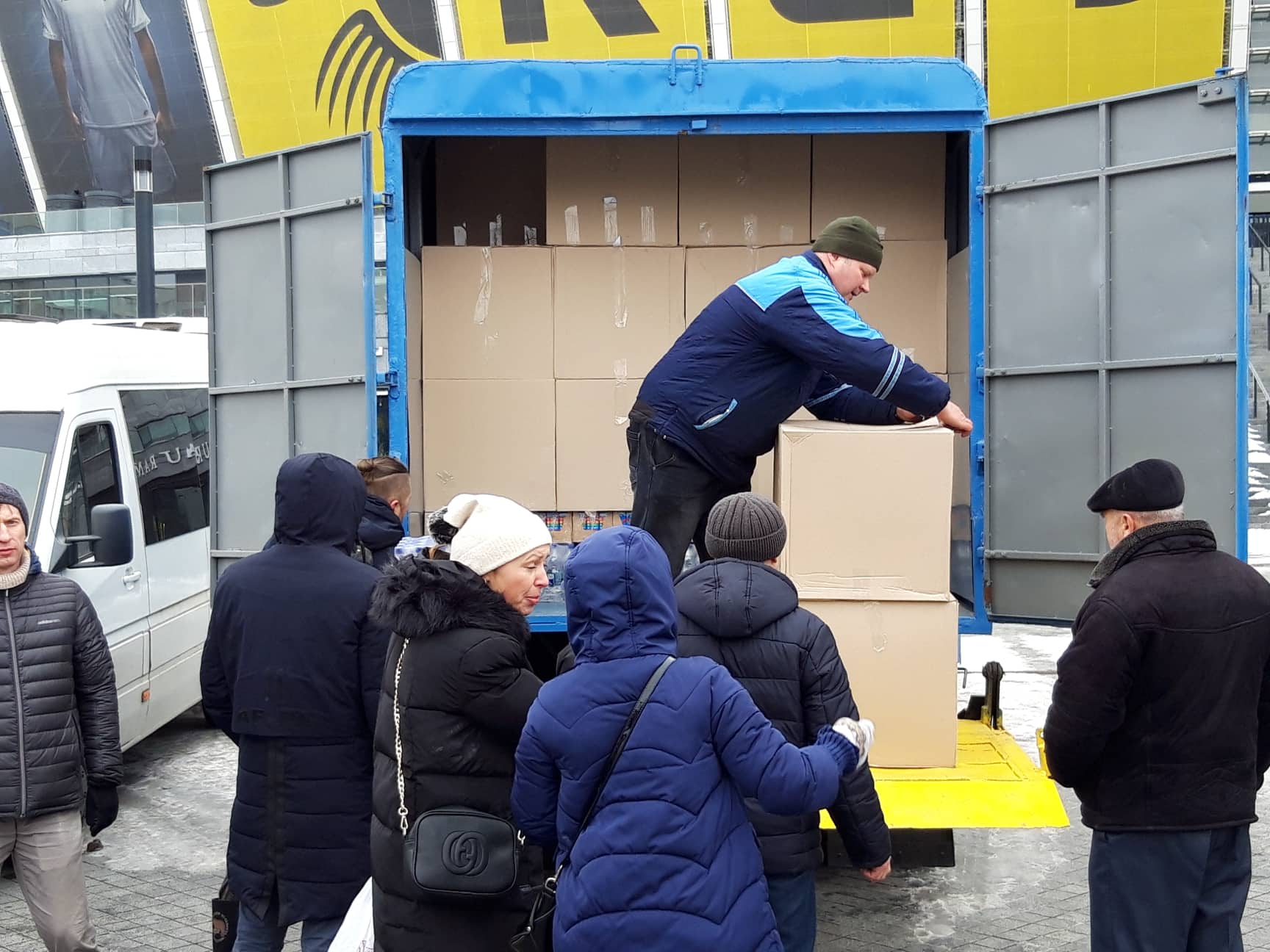 В этих же коробках портреты Порошенко в бумажной рамке, чтобы ставить на стол. Однако люди почему-то стыдливо прячут содержимое пакетов, в которых еще флаг на пластиковой ножке.