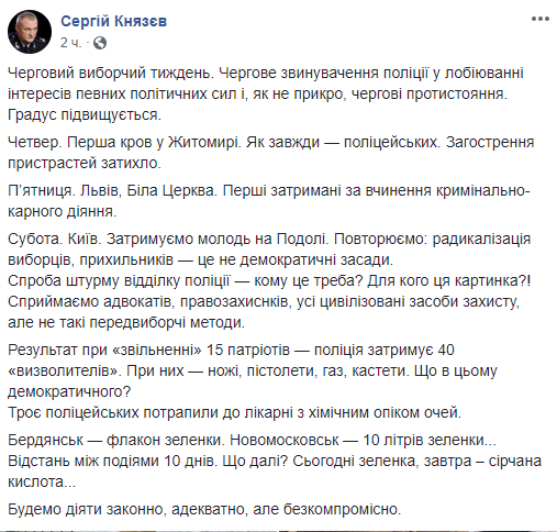 "Попытка штурма отделения полиции - кому это нужно? Для кого эта картинка?! Воспринимаем адвокатов, правозащитников, все цивилизованные средства защиты, но не такие предвыборные методы", - сообщил Князев.
