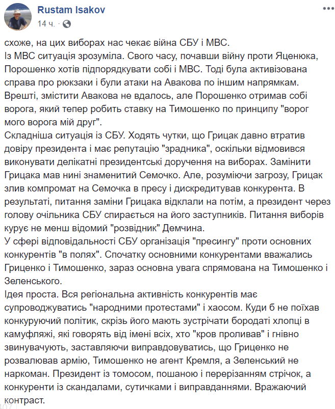 Блогер Рустам Исаков считает, что перед выборами начинается война между СБУ и МВД.