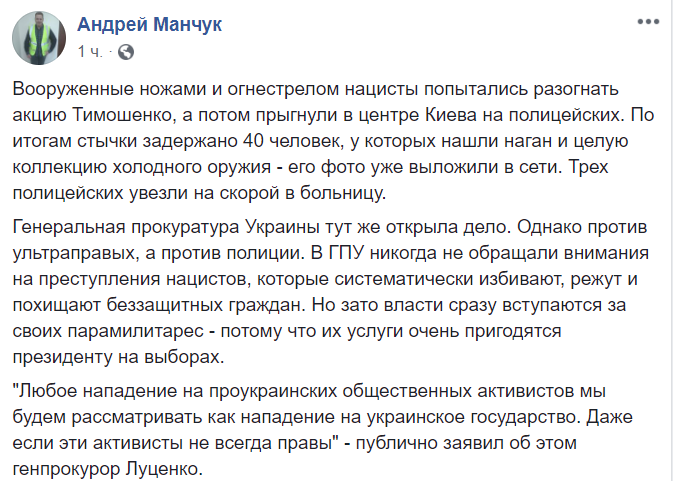 "С14 (СБУ-Порошено) пришли на предвыборный митинг Ю.Тимошенко с целью провокации под повод соучастия человека Тимошенко ("Батькивщины") в нападении на Екатерину Гандзюк, которая, в свою очередь, отличалась нападками на Нацполицию в Херсоне.