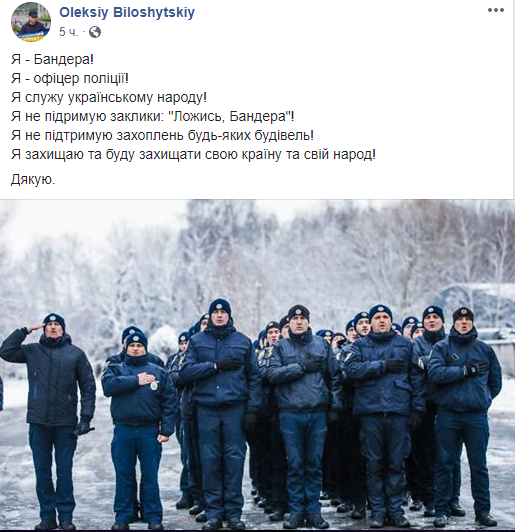 "Я - Бандера Я - офицер полиции! Я служу украинскому народу! Я не поддерживаю призывы: "Ложись, Бандера!". Я не поддерживаю захвата любых зданий Я защищаю и буду защищать свою страну и свой народ!", - написал первый заместитель начальника Департамента патрульной полиции Алексей Билошицкий на своей странице в Facebook.
