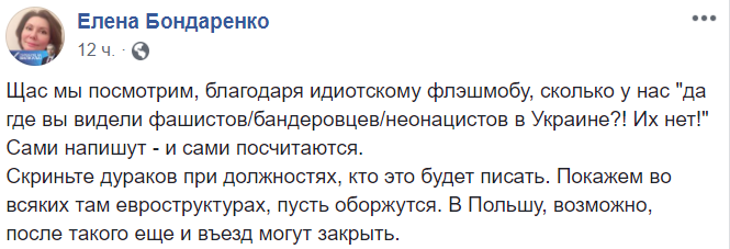 Скриньте дураков при должностях, кто это будет писать. Покажем во всяких там евроструктурах, пусть оборжутся. В Польшу, возможно, после такого еще и въезд могут закрыть", - пишет экс-нардеп Елена Бондаренко.