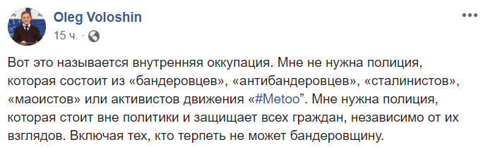 "Вот это называется внутренняя оккупация. Мне не нужна полиция, которая состоит из "бандеровцев", "антибандеровцев", "сталинистов", "маоистов"" или активистов движения "#Metoo". Мне нужна полиция, которая стоит вне политики и защищает всех граждан, независимо от их взглядов. Включая тех, кто терпеть не может бандеровщину".