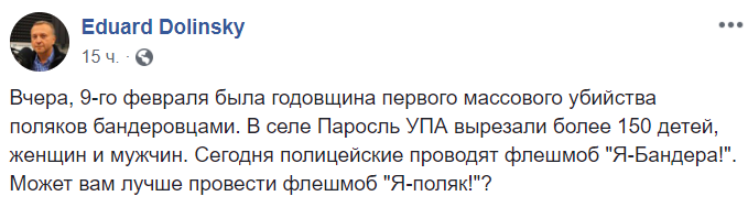 "Вчера, 9-го февраля была годовщина первого массового убийства поляков бандеровцами. В селе Паросль УПА вырезали более 150 детей, женщин и мужчин. Сегодня полицейские проводят флешмоб "Я-Бандера!". Может вам лучше провести флешмоб "Я-поляк!"?", - поинтересовался глава украинского Еврейского комитета Эдуард Долинский.