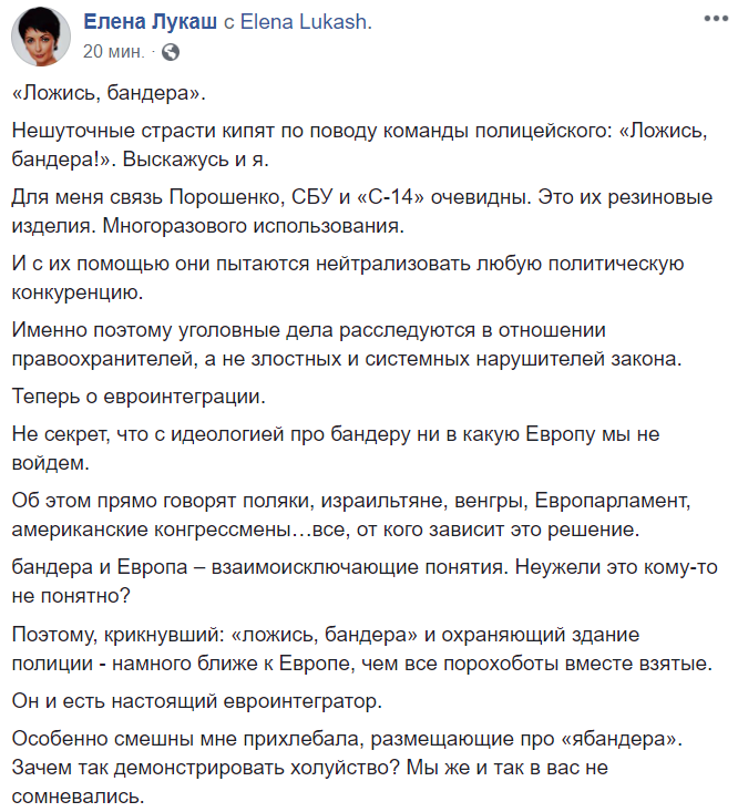 Адвокат Елена Лукаш говорит, что с публичным каминг-аутом руководства полиции насчет Бандеры, Украину в Европу не пустят.