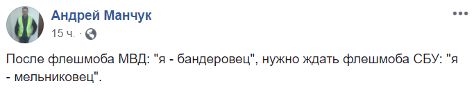 "После флешмоба МВД: "я - бандеровец", нужно ждать флешмоба СБУ: "я - мельниковец"", - пишет журналист Андрей Манчук. Мельниковцы - это часть ОУН, которые конфликтовали с бандеровской частью организации. И отличались более тесным сотрудничеством с нацистами.