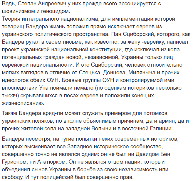 Бандера несмотря, на тугие попытки неких современных историков, которых высмеивает все Западное историческое сообщество, совершенно точно не являлся одним: он не был ни Давидом Бен Гурионом, ни Ататюрком. Он не являлся отцом нации, который объединил сынов Украины в борьбе за свою независимость или свободу. И тут полицейский был совершенно прав".