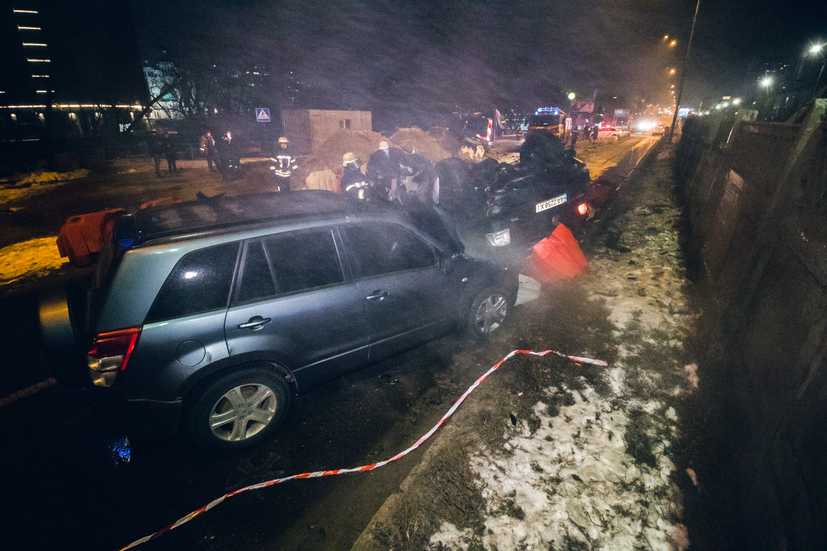 "Авария случилась около 21:00 возле съезда с моста Метро на левом берегу. Volkswagen Touareg не успел остановиться перед сужением дороги из-за ремонтных работ. В результате "немец" протаранил припаркованный прицеп, вылетел на встречную полосу и перевернулся. В это время ему навстречу двигалась Suzuki Vitara. Водитель "японца" не успел затормозить, и Touareg повредил капот Suzuki", - рассказали свидетели ДТП.