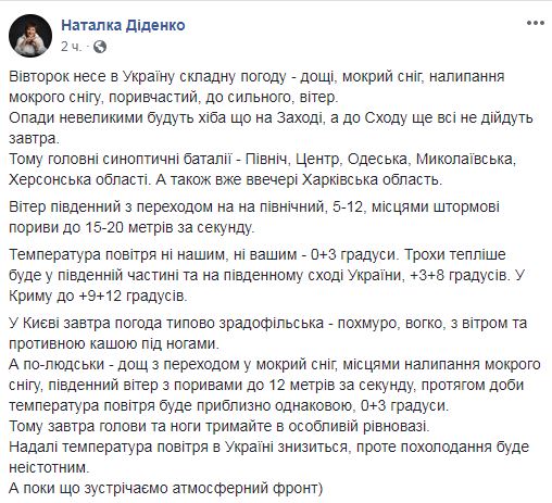 Во вторник, 12 февраля, в Украине ожидаются сложные погодные условия - дожди, мокрый снег, налипание мокрого снега, сильный порывистый ветер. Об этом сообщила синоптик Наталья Диденко на странице в Facebook.