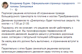 "Подписал решение исполкома об ограничении проезда большегрузного транспорта по плотине и мостам Преображенского. Движение грузовиков по "Днепрогэсу" будет полностью закрыто. На мостах - с 7:00 до 21:00", - говорится в сообщении.