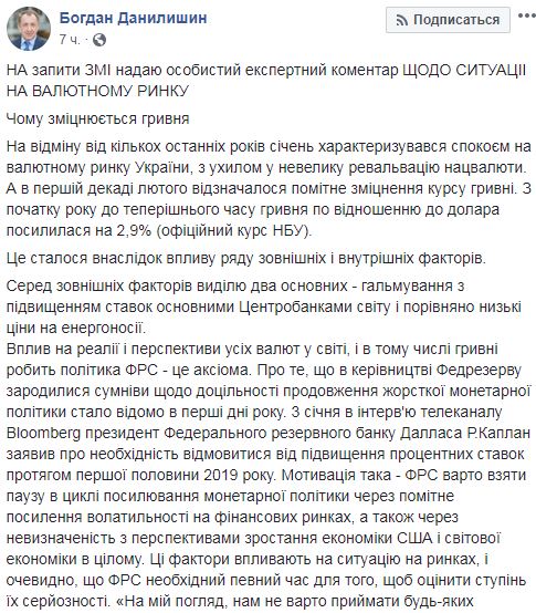 Укрепление официального курса гривны к доллару с начала года на 2,9% произошло в результате воздействия ряда внешних и внутренних факторов. Об этом пишет глава Совета НБУ Богдан Данилишин в Facebook.