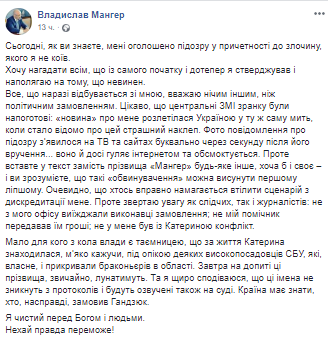 Мало для кого из круга власти секрет, что при жизни Екатерина находилась, мягко говоря, под опекой некоторых высокоставленников СБУ, которые, собственно, и прикрывали браконьеров в области. Завтра на допросе эти фамилии, конечно, будут звучать. И я искренне надеюсь, что эти имена не исчезнут из протоколов и будут озвучены также на суде. Страна должна знать, кто на самом деле заказал Гандзюк", - говорится в сообщении. Также Мангер назвал случившееся с ним политическим заказом, а обвинения - клеветой.