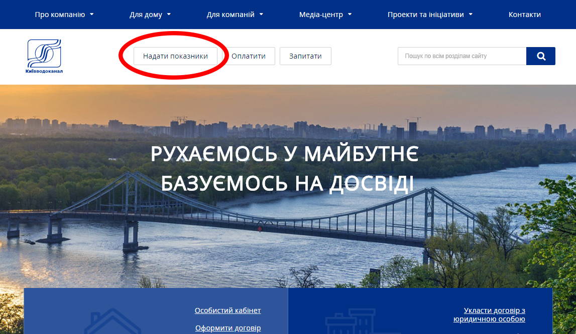 - на сайте Киевводоканала, нажав на главной странице кнопку "предоставить показания";
