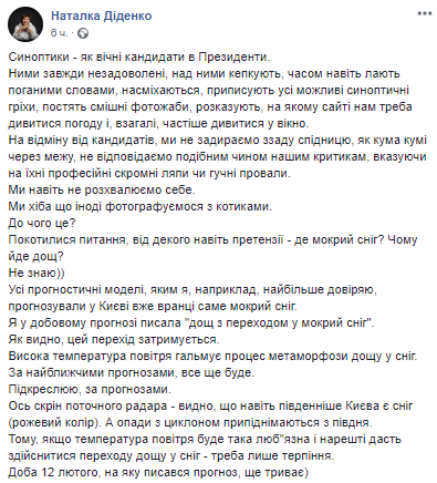 Синоптик Наталья Диденко признала в социальной сети Facebook, что ее прогноз о мокром снеге в столице пока не оправдался и объяснила, почему так произошло.