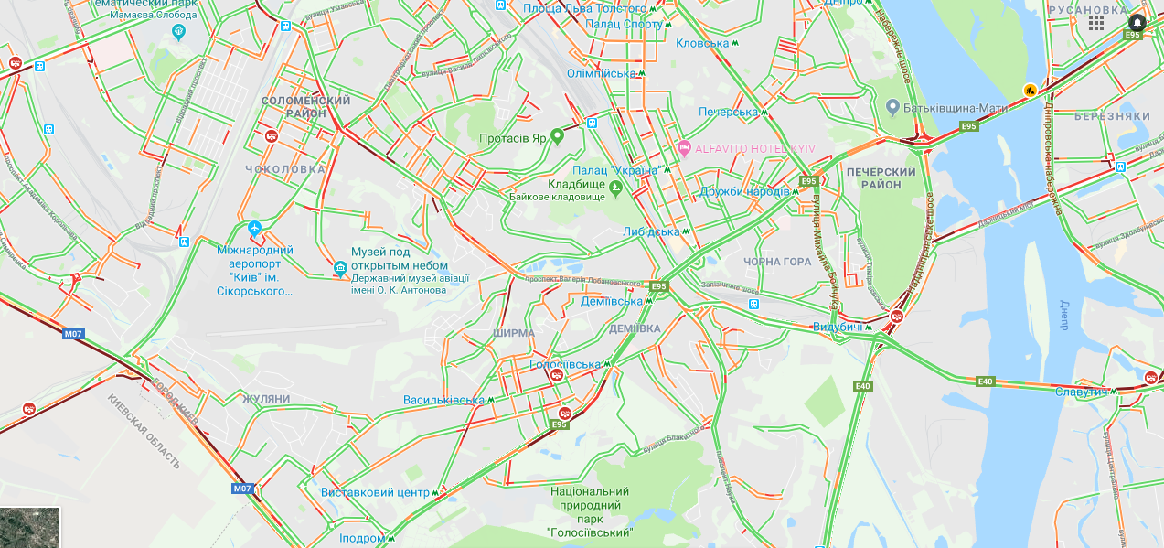 Сложнее всего проехать по проспекту Победы и Голосеевскому, бульвару Тараса Шевченко, Владимирскому спуску, Набережному шоссе, улице Саксаганского, Богдана Хмельницкого, Короленковской, Бассейной, Большой Житомирской, бульвару Дружбы народов, проспекту Валерия Лобановского. Стоит также и Борщаговка.