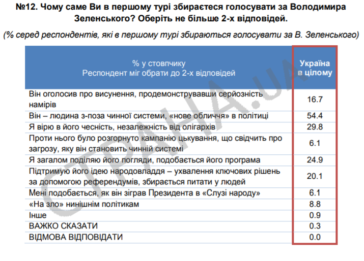 Украинцы объяснили свой выбор именно Зеленского тем, что он "новое лицо" в политике и "не зависим от олигархов".