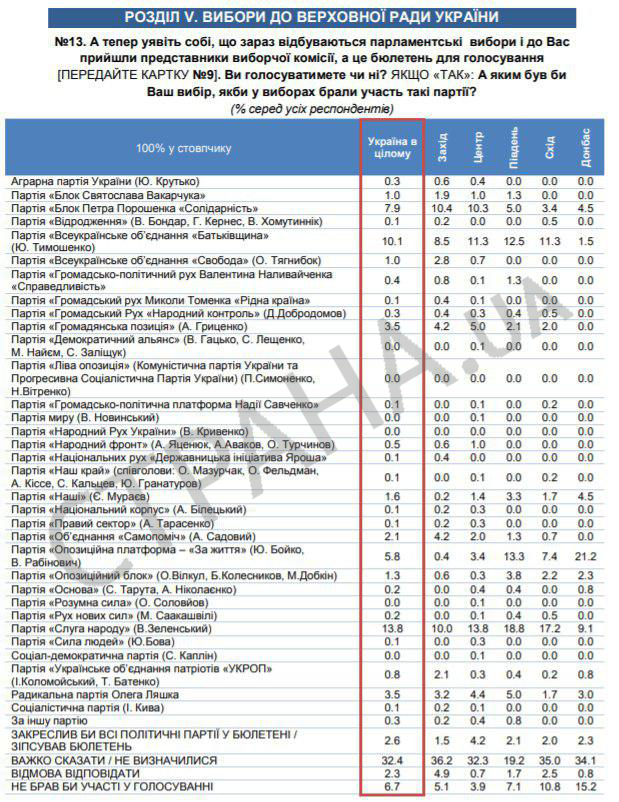 Первое занимает политсила Зеленского "Слуга народа". Она получила поддержку 13,8% респондентов (либо 24,6% от числа определившихся). На втором месте с 10,1% - ВО "Батькивщина" (18% от определившихся). Третье место с 7,9% (14,2%) занял "Блок Петра Порошенко "Солидарность".
