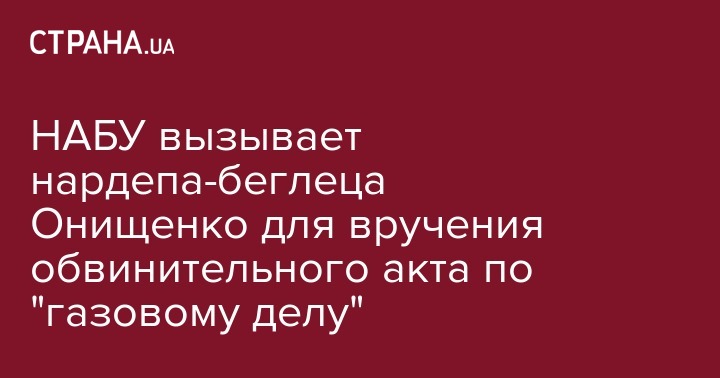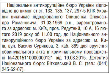 Национальное антикоррупционное бюро (НАБУ) вызывает для вручения обвинительного акта беглого нардепа Александра Онищенко, подозреваемого в создании незаконной газовой схемы. Об этом свидетельствует повестка, опубликованная в официальной правительственной газете "Урядовый курьер", пишет Украинская правда.