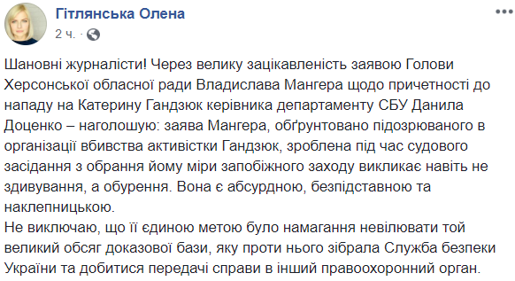 "Из-за большой заинтересованности заявлением главы Херсонского областного совета Владислава Мангера о причастности к нападению на Екатерину Гандзюк руководителя департамента СБУ Даниила Доценко – подчеркиваю: заявление Мангера относительно подозреваемого в организации убийства активистки Гандзюк, сделанное во время судебного заседания по избранию ему меры пресечения вызывает даже не удивление, а возмущение. Оно является абсурдным, безосновательным и клеветническим", - написала в Facebook спикер ведомства Елена Гитлянская.
