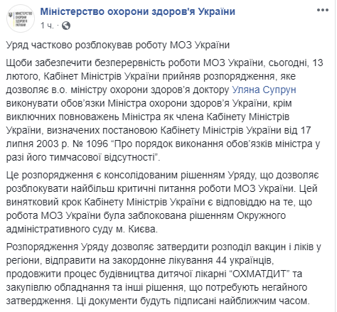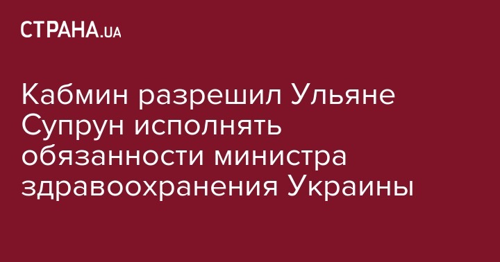 "С целью обеспечения непрерывности работы Министерства здравоохранения Украины первому заместителю министра здравоохранения Украины Супрун Уляне временно, до назначения министра здравоохранения Украины в установленном законом порядке, обеспечить исполнение обязанностей министра здравоохранения Украины, кроме исключительных полномочий министра как члена Кабинета министров Украины, определенных постановлением Кабинета министров Украины от 17 июля 2003 года №1096 "О порядке исполнения обязанностей министра в случае его временного отсутствия", - говорится в распоряжением №57-р от 13 февраля.