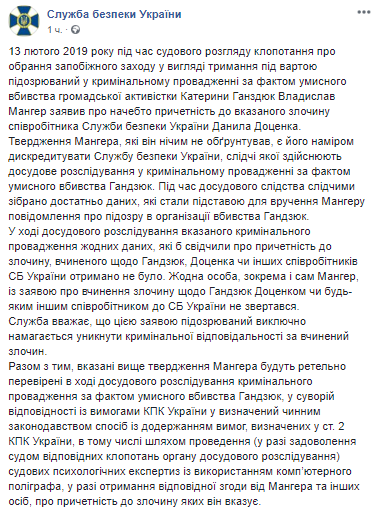 "13 февраля 2019 года во время судебного рассмотрения ходатайства об избрании меры пресечения в виде содержания под стражей подозреваемый в уголовном производстве по факту умышленного убийства общественной активистки Екатерины Ганздюк Владислав Мангер заявил о якобы причастности к указанному преступлению сотрудника Службы безопасности Украины Даниила Доценко. Утверждение Мангера, которые он ничем не обосновал, является его намерением дискредитировать Службу безопасности Украины, следователи которой осуществляют досудебное расследование в уголовном производстве по факту умышленного убийства Гандзюк", - говорится в сообщении.