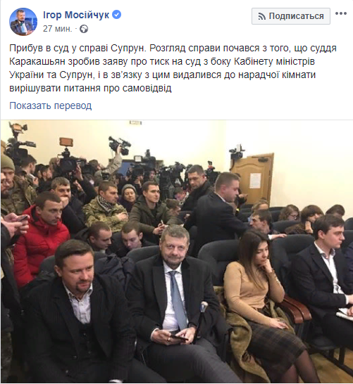 Через нескольку минут после начала заседания, судья по делу Ульяны Супрун Сергей Каракашьян сообщил, что берет самоотвод, и покинул зал заседаний, удалившись в комнату для совещаний. По его словам, он вынужден это сделать из-за оказываемого на него давления со стороны Кабмина и Супрун.