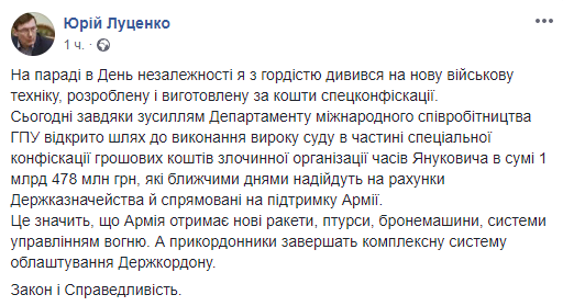 Апелляционный суд Черкасской области в порядке спецконфискации зачислил с государственный бюджет Украины еще 1 млрд 478 млн грн. Об этом сообщил генеральный прокурор Украины Юрий Луценко на своей странице в социальной сети Facebook.